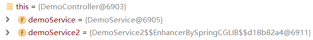 将断点打在 /doTransaction 对应的方法上,Debug 重新启动工程,待断点落下后,发现被 Realm 依赖的 DemoService 不是代理对象,而没有被 Realm 依赖的 DemoService2 经过事务的增强,成为了一个代理对象: