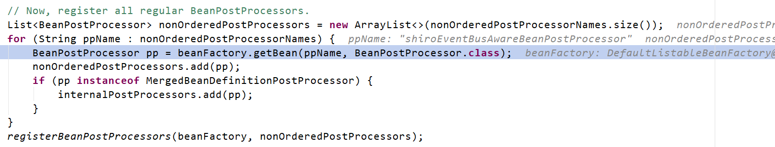 DemoService 中的断点不要去掉,重新 Debug 让断点停在那里,翻到最底下的调用栈,查看那个正在创建的 BeanPostProcessor ,发现它的名称是 shiroEventBusAwareBeanPostProcessor :