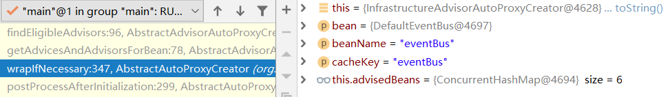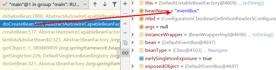 }顺着方法调用栈往上爬,找到下一个 doCreateBean ,发现确实有创建 eventBus 的部分: