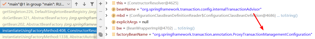 由于在 SpringFramework 中,使用 @Configuration + @Bean 声明的 Bean ,都是要先把配置类初始化好,才能创建 Bean 。所以继续往上爬调用栈时,会发现它并没有接着创建 Shiro 的增强器 authorizationAttributeSourceAdvisor ,而是先初始化了声明有 TransactionAttributeSourceAdvisor 的配置类 ProxyTransactionManagementConfiguration :